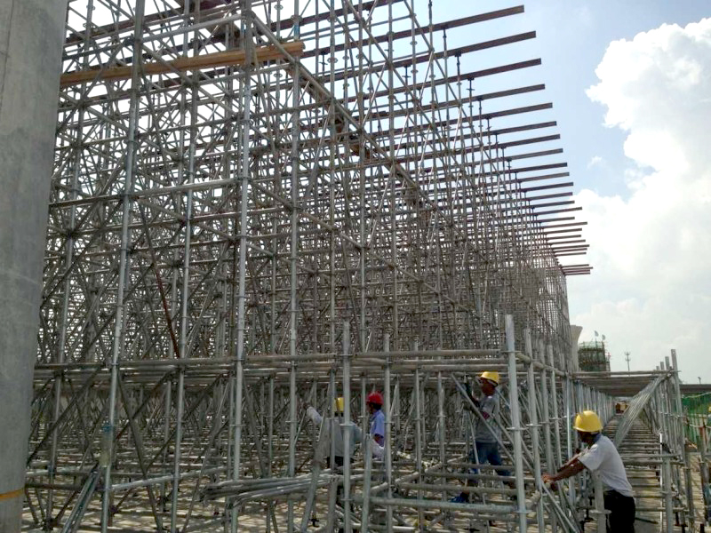 在如今的建筑行業(yè)中,經(jīng)??梢钥吹绞┕すさ赜谐胁逍捅P扣式腳手架的存在。這種新型承插型盤扣式腳手架便于應(yīng)用在工業(yè)當(dāng)中,提升施工效率。此裝備是采用每個承載管的搭接,并且兩段有卡入式的接口,使得盤扣式腳手架的橫桿和斜拉桿的端口進(jìn)行插入搭接。參照幾何穩(wěn)定性的原理,而且立桿,橫桿和底座等都可以進(jìn)行自主的搭接。為什么這兩年盤扣式腳手架可以迅速的推進(jìn)到可以應(yīng)用的工業(yè)當(dāng)中,是因?yàn)樗旧泶嬖谥S多的優(yōu)勢。
